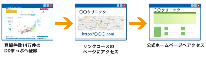登録件数14万件を誇る医療専門ポータルサイト「DDまっぷ」に公式ホームページのアドレスを掲載するだけで、患者さんをスムーズに誘導できます。